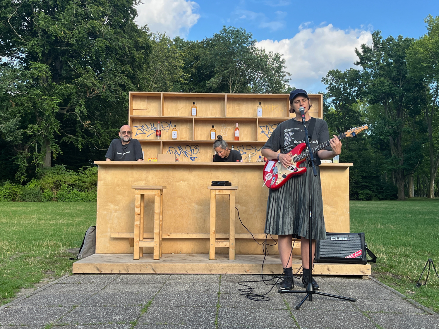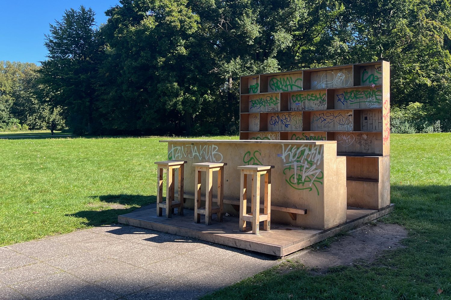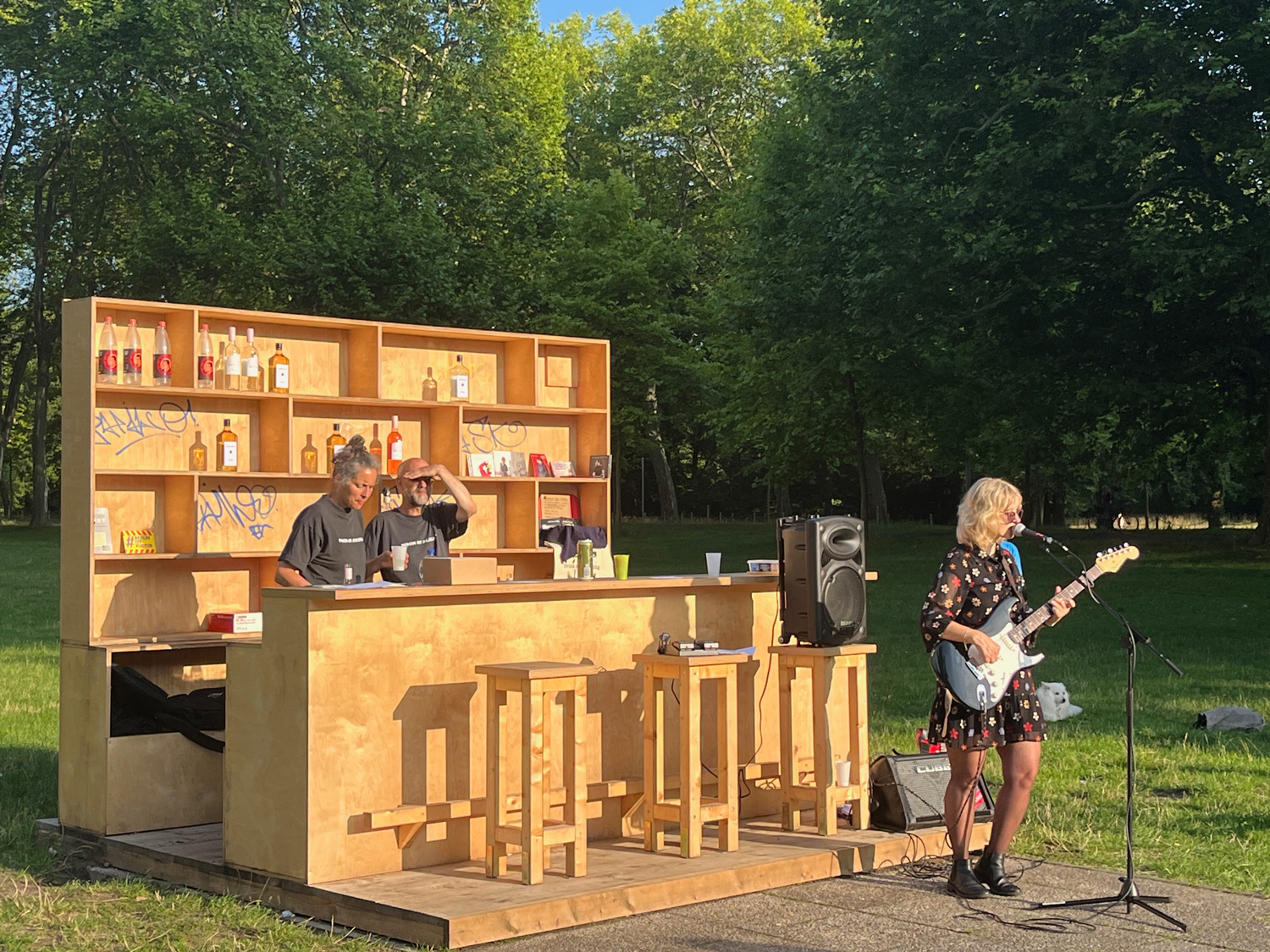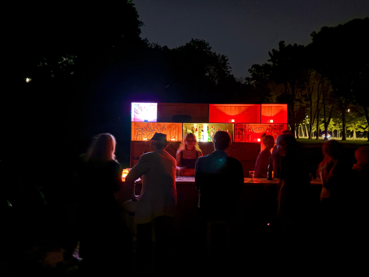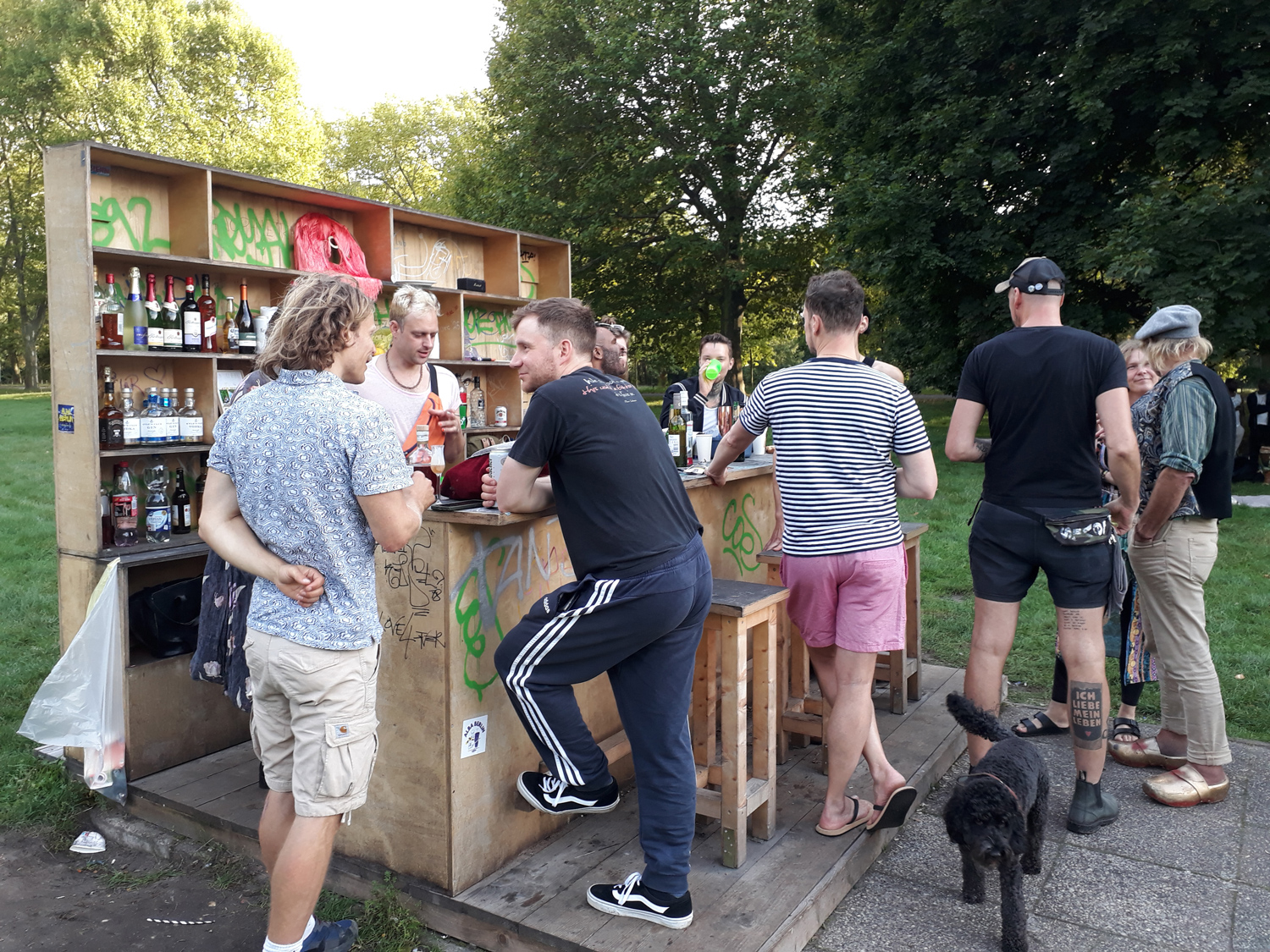 Und so kann sie natürlich auch von uns, von den Besucher*innen des Parks genutzt werden. Es steht allen frei, die Rolle des Barkeepers, der Barkeeperin zu übernehmen und Drinks zu servieren, die er oder sie mitgebracht haben. Ebenso kann sich Jede und Jeder an die Bar stellen oder setzen und auf den nächsten Drink warten.