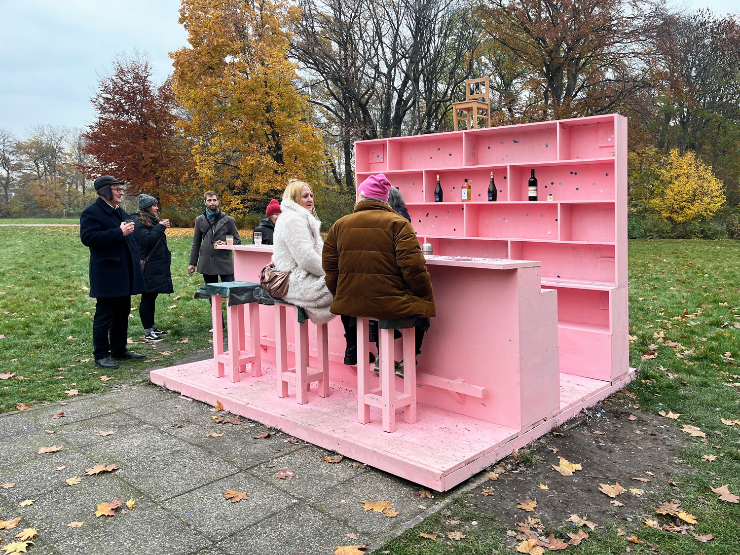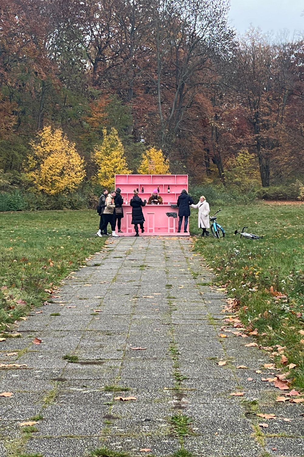 Am Ende des Weges im Rosengarten wird eine Skulptur in Form einer Bar installiert. Die skulpturale Setzung beschließt den Weg, der eigentlich ins Nichts führt und öffnet gleichzeitig eine neue, völlig unerwartete Welt im Treptower Park: Eine klassische Bar mitten im Grünen.
